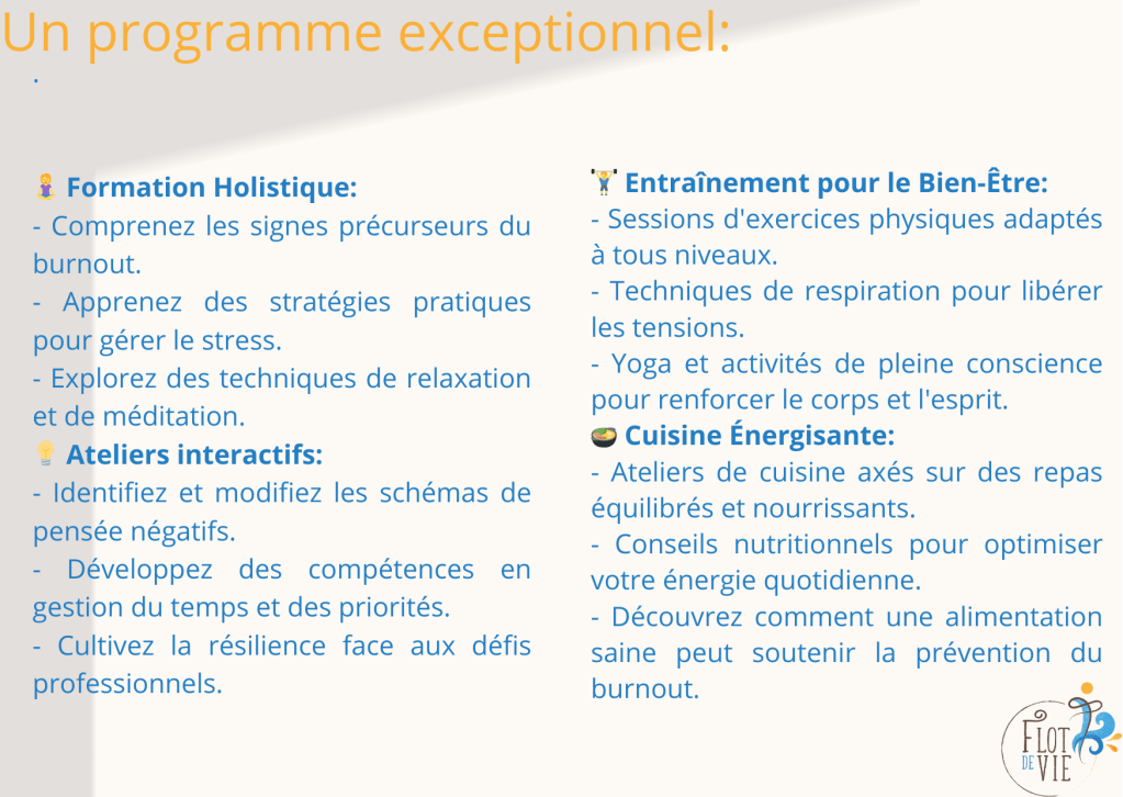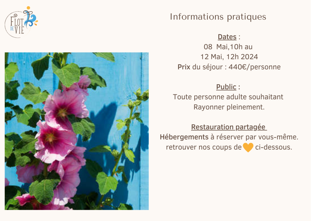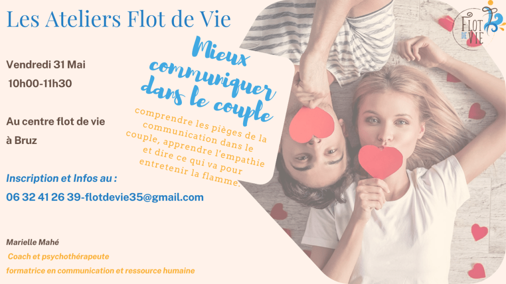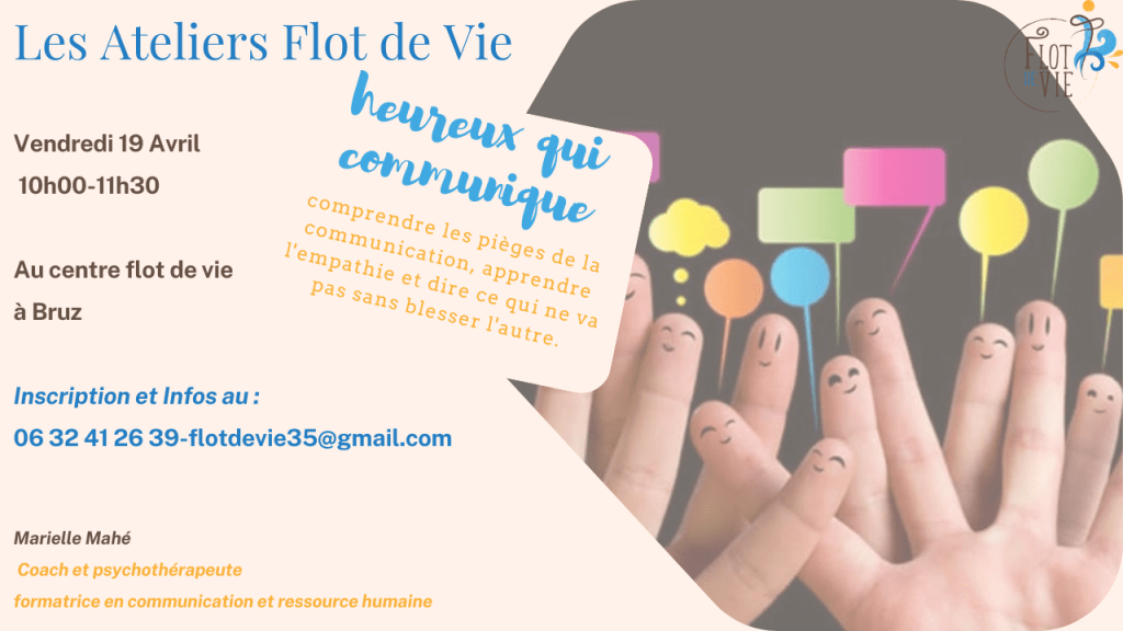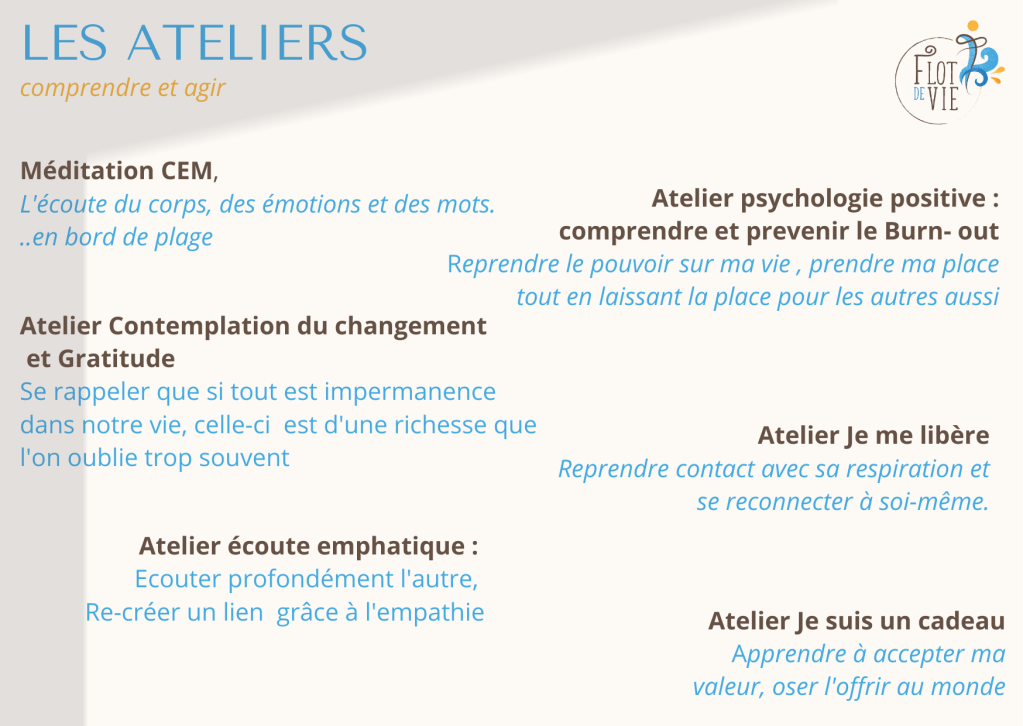 Cette année l’association Flot de Vie vous propose des training chaque fin de mois. Un atelier de 2h ou une formation (journée) pour échanger sur le thème du mois et repartir avec des outils concrets pour mieux vivre au quotidien.